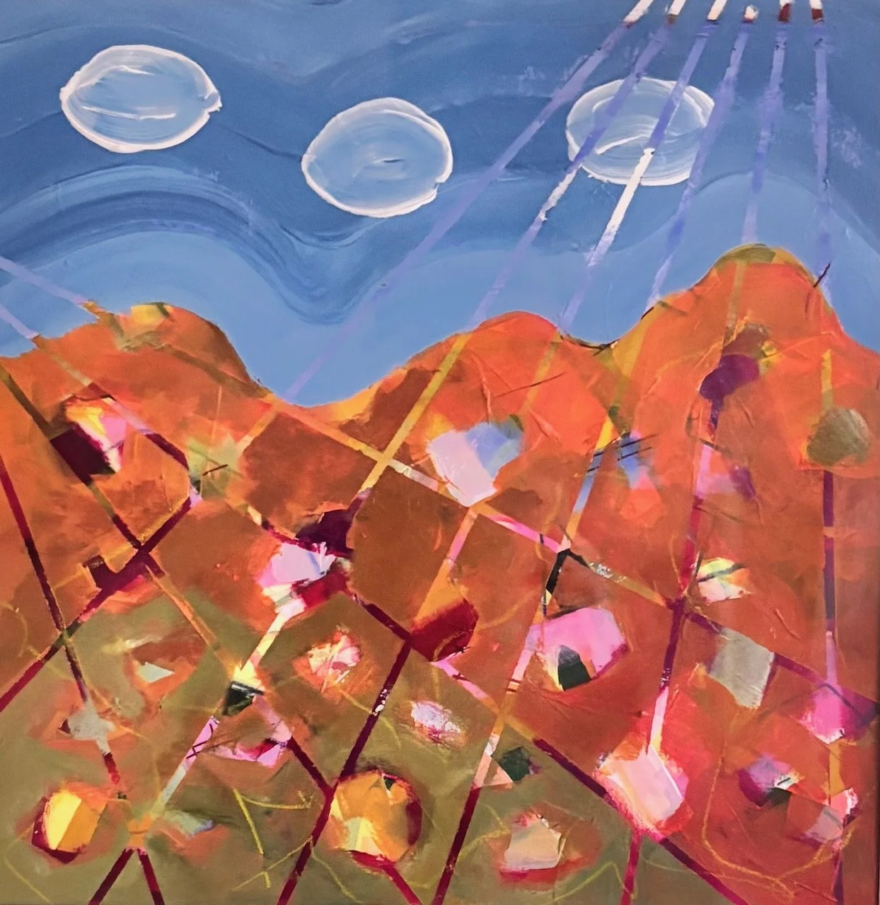 The Underside: marking time. Mixed Media, 28 cm x 28 cm. The painting responds to a song that explores what lies beneath the landscape. The song is found on Spotify and other streaming channels. Click here